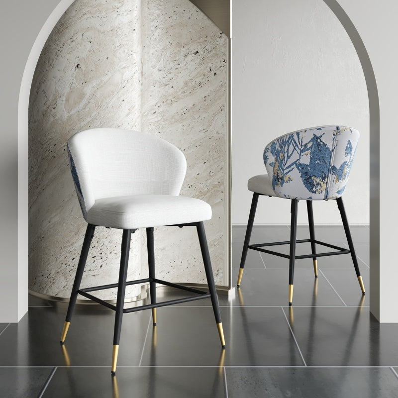 Crafted with a sturdy metal frame, these counter-height bar stools are adorned with black and golden footrests and a chic blue and golden jacquard cover.The modern design brings a touch of sophistication to your kitchen or dining area.