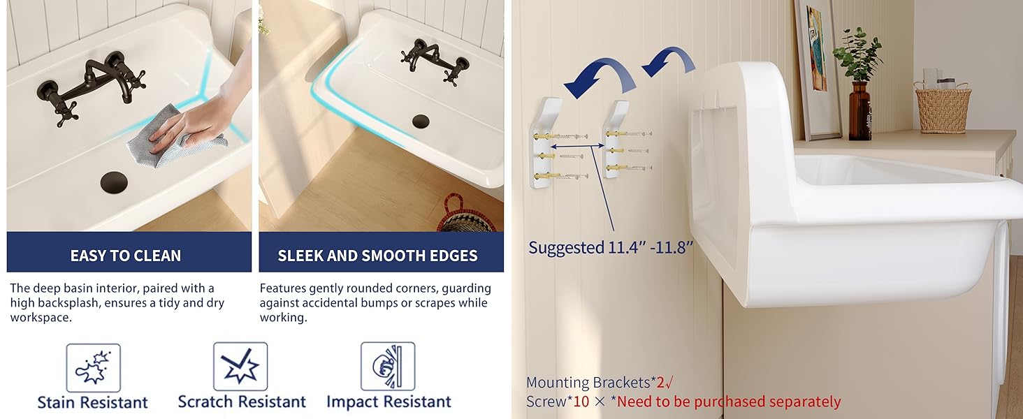 ELLAI Farmhouse Wall-Mount Laundry Sink, 36-Inch High-Back