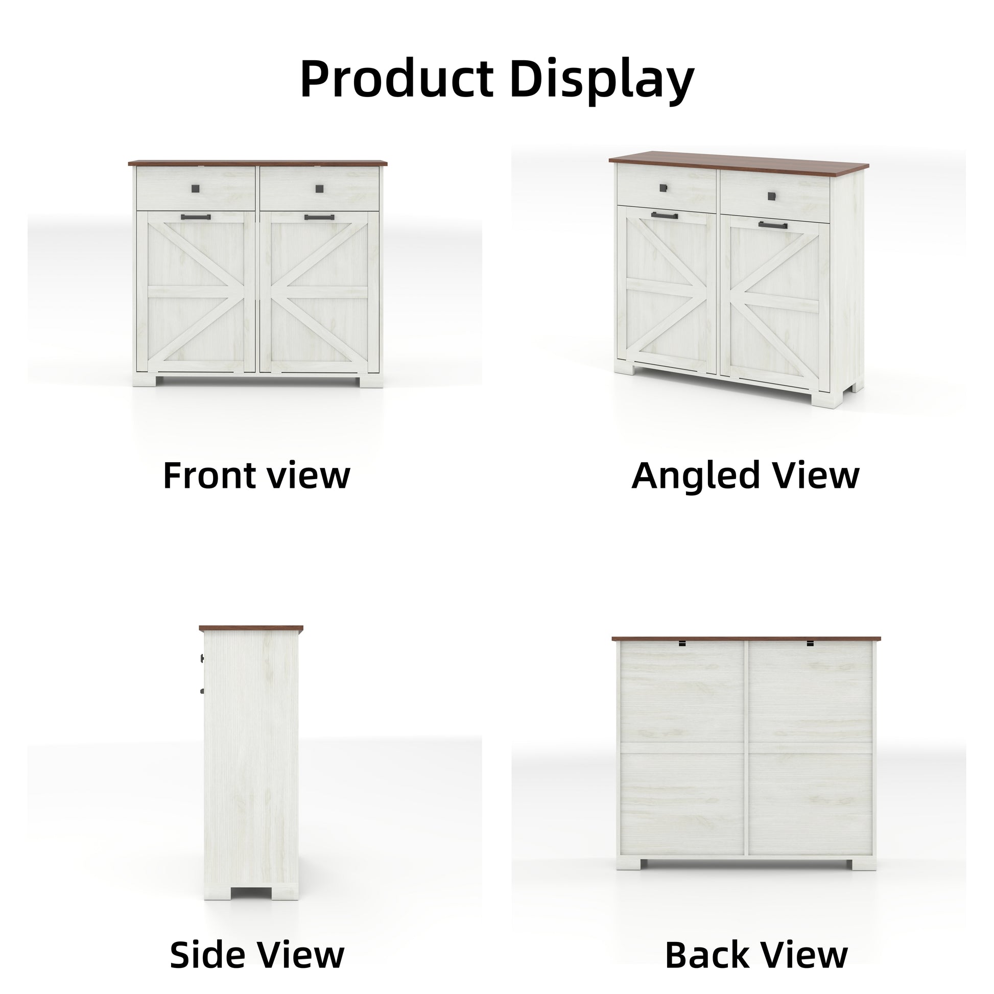 Highlights | 1.Space-saving hidden design fits 2x10gal bins, blocks odors, pets, and doubles as pet food/recycling storage. 2.Farmhouse barn door style, versatile for kitchens/homes, stores supplies/pet food, with slanted drawer + 2 pull-outs for laundry. 3.Durable/stable, holds 40lbs, fits 2x10gal bins (not included), countertop stores appliances like microwaves/coffee makers. 4.Engineered wood with polished finish: elegant, sleek, and easy to clean. |