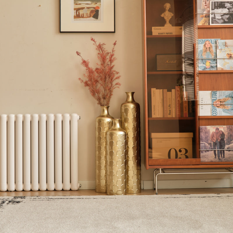 - Decorative white vases: these tall metal vases feature a blend of polished and hammered gold finishes