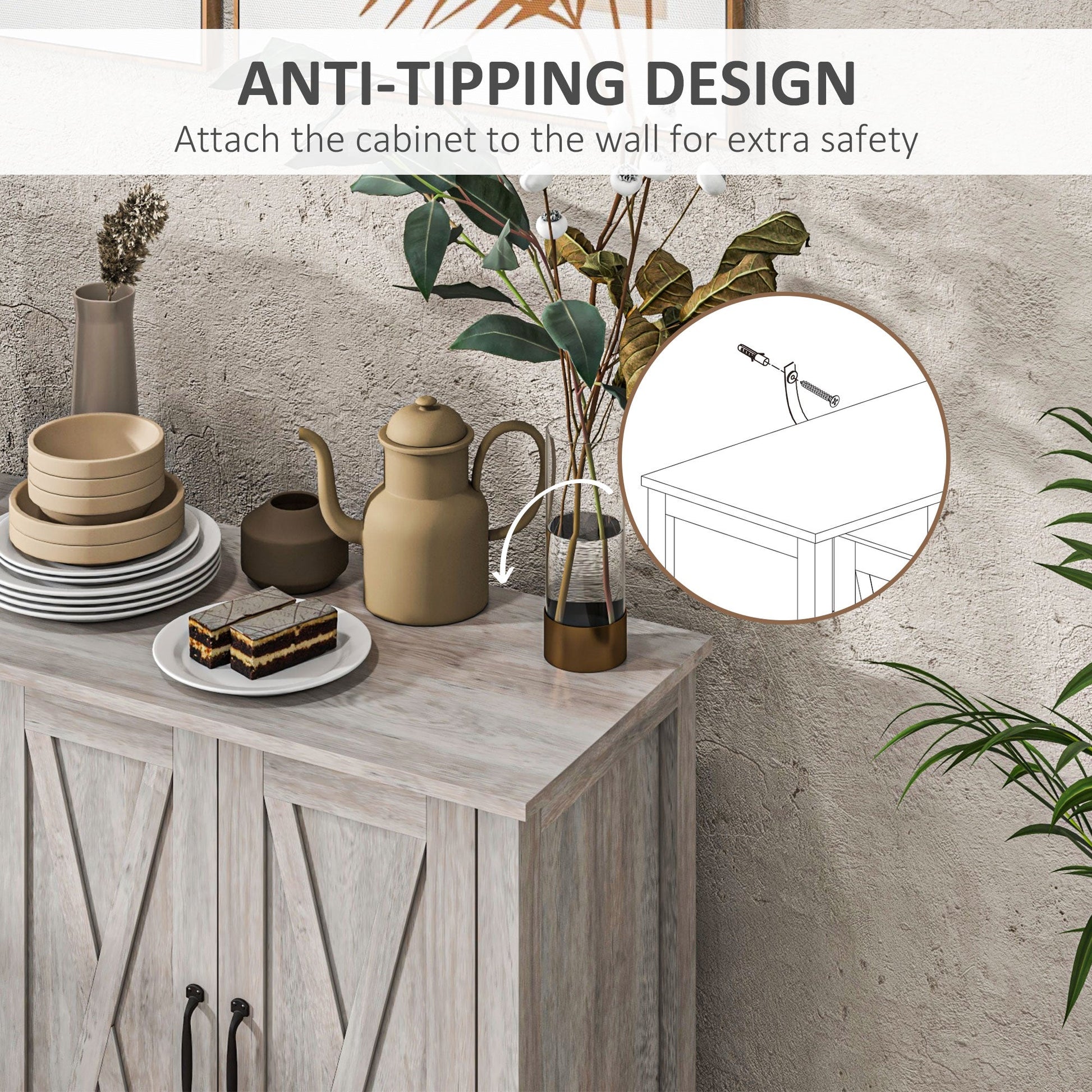 Revamp your living space with the HOMCOM farmhouse sideboard. Organize your dinnerware, pots, and pans easily using the four compartments. Also, it adapts to storage needs with two adjustable shelves inside the buffet. This kitchen buffet cabinet with barn doors will instantly upgrade your dining room, living room, or entryway with its farmhouse appearance and versatile storage space. Whatever your storage needs, this storage cabinet will house all the essentials with functional finesse.